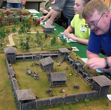 The Ohio Frontier Aflame heads north to Drums at Fort Meigs — an HMGS Great Lakes convention held in the visitors center of Fort Meigs, Perrysville, OH. The fort is a reconstructed War of 1812 fort and an atmospheric place to do French & Indian War gaming. In fact, we could look at the window at the wooden palisades as we played, then go for a walk amongst the blockhouses and artillery batteries afterwards.
