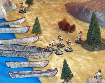 The saga of the Raid on Fergusson’s Farm enters its 6th chapter. In this series of linked scenarios, our avid French player, Eric of the Ch’ti Re-Animator website, stages a battle between colonial militia and a warparty of Abenaki warriors. The warriors spot the militia, who have been ordered to guard the canoes for a punitive expedition. They creep up on them and launch a surprise attack.